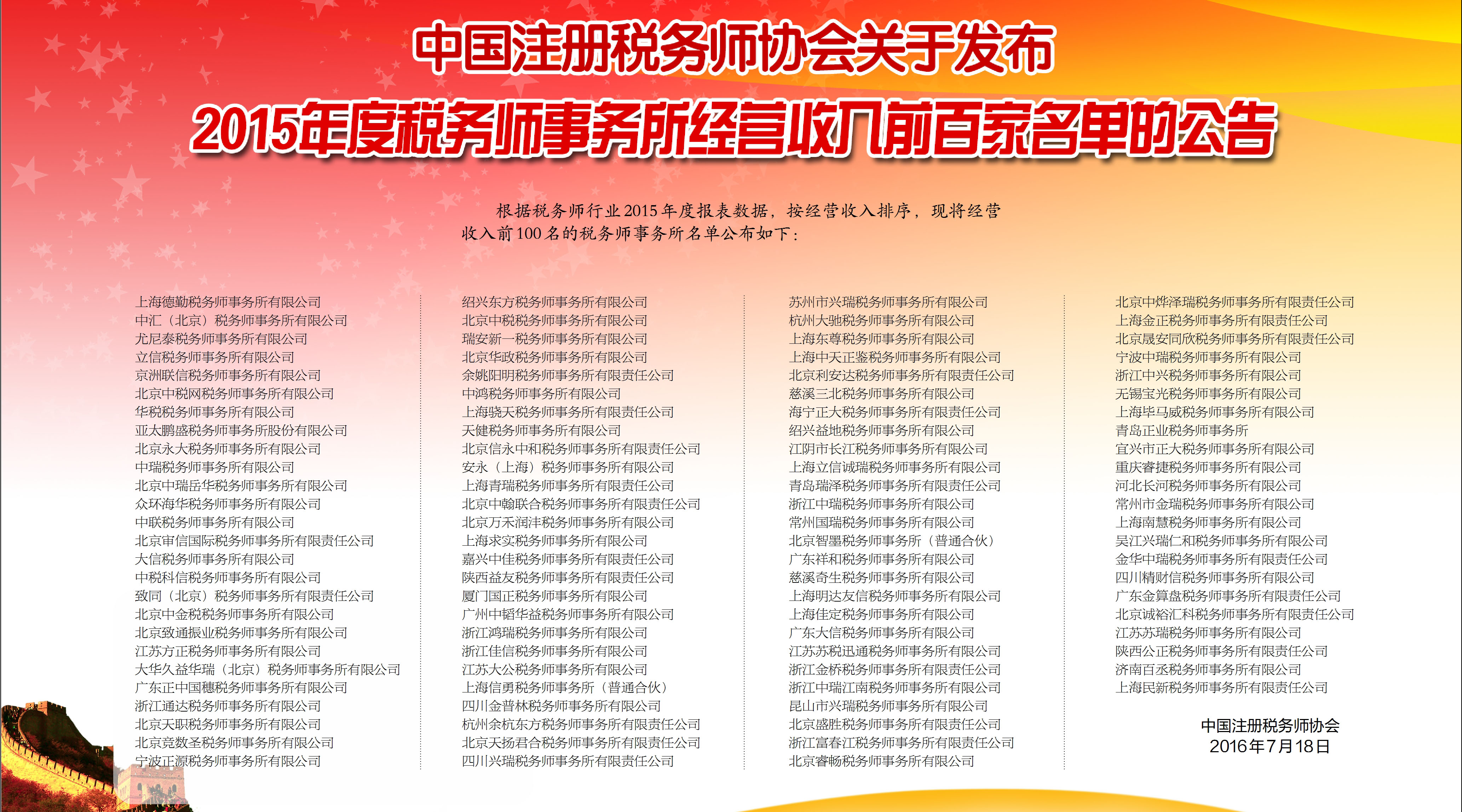 2016年7月18日,中國注冊稅務(wù)師協(xié)會(huì)在“2015年度稅務(wù)師行業(yè)收入百強(qiáng)發(fā)布會(huì)”上,中稅協(xié)副會(huì)長權(quán)芳樓宣讀了《2015年度稅務(wù)師事務(wù)所經(jīng)營收入前百家名單》的榜單。