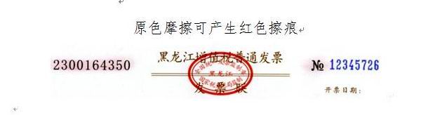 使用白紙摩擦票面的發(fā)票代碼和字符(№)區(qū)域,在白紙表面以及發(fā)票代碼和字符(№)的摩擦區(qū)域均會產(chǎn)生紅色擦痕。(如下圖所示)